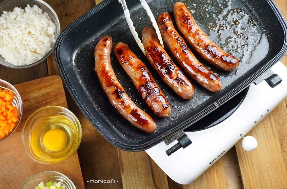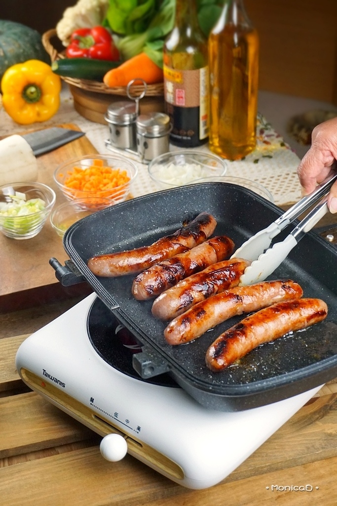 之前操作烤箱和氣炸鍋小家電煎香腸,通常難以控制火候,炙焰電陶爐能即時調整溫度,滿足對火力的需求,首先在平底鍋滴入少許食用油,以小火加熱香腸,慢慢翻煎讓绞肉油脂融化,大約需要 10 分鐘均熟,最後轉中火形成油炸似的將腸衣烤酥,一口咬下去內熟多汁外焦香脆。