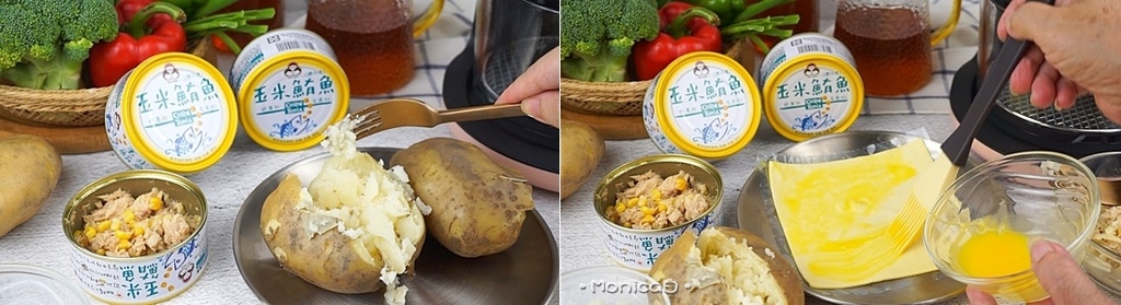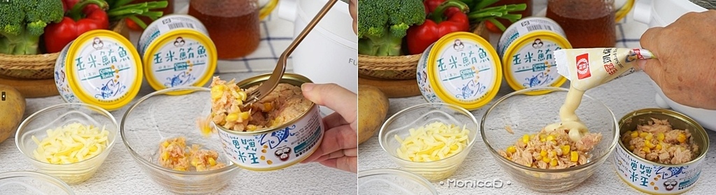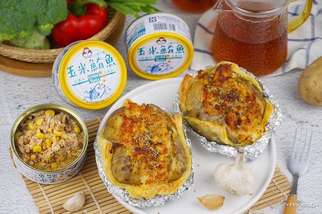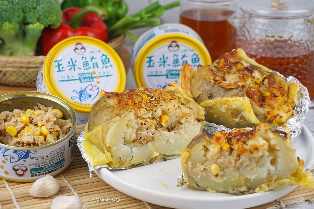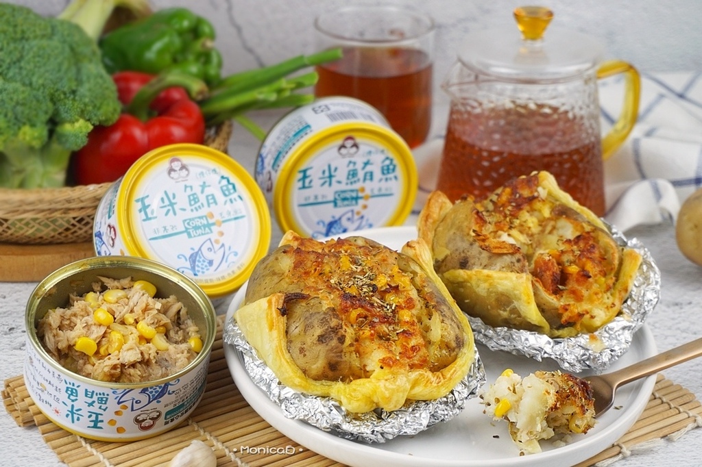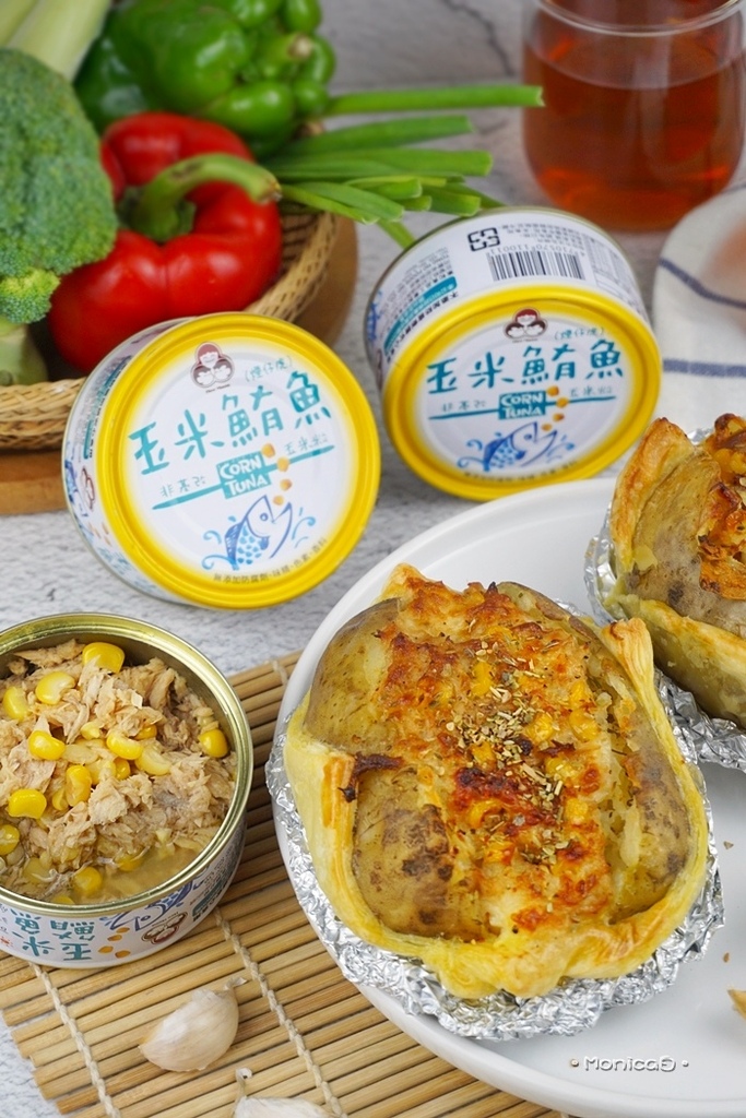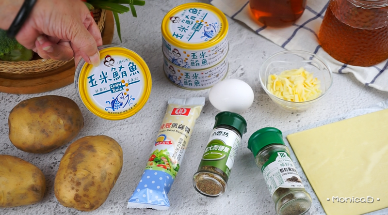《食材》無添加玉米鮪魚、馬鈴薯、雞蛋、凱薩醬、乳酪絲、起酥片、綜合義大利香草、黑胡椒。