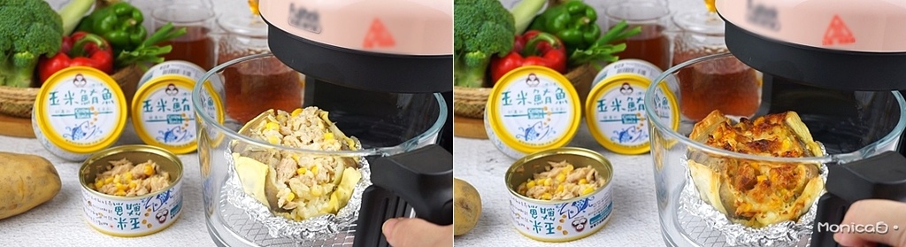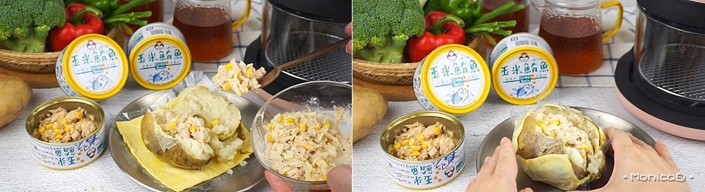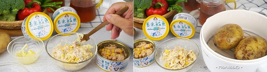 《作法一》取適量玉米鮪魚,淋入凱薩醬、撒上黑胡椒充分攪拌均勻,再加入乳酪絲,全食材拌勻備用。將馬鈴薯蒸熟,電鍋以小火蒸約 20-30 分鐘。