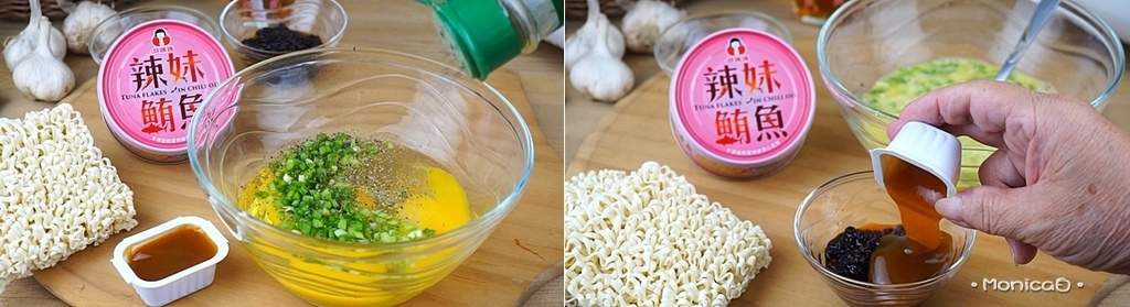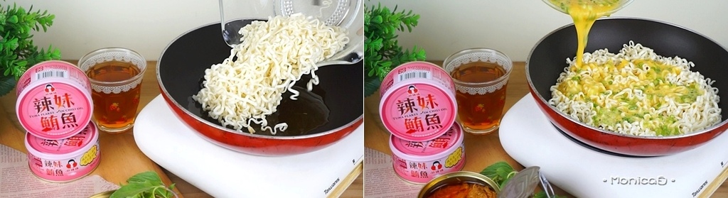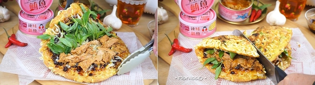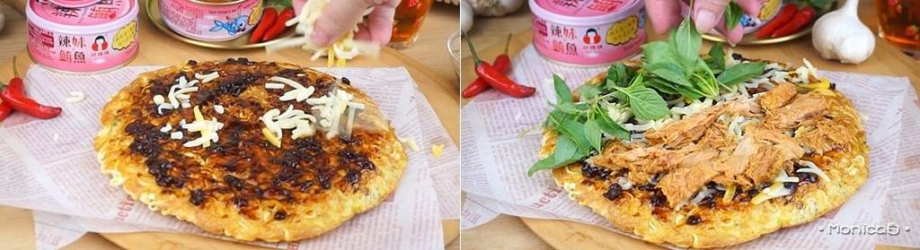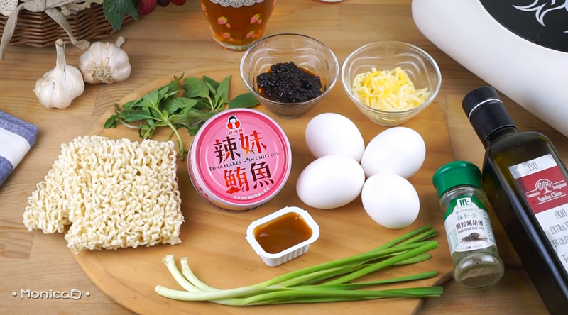 《食材》辣妹鮪魚、泡麵、雞蛋、韭菜、九層塔、黑胡椒、炸醬、糖醋醬、乳酪絲。
