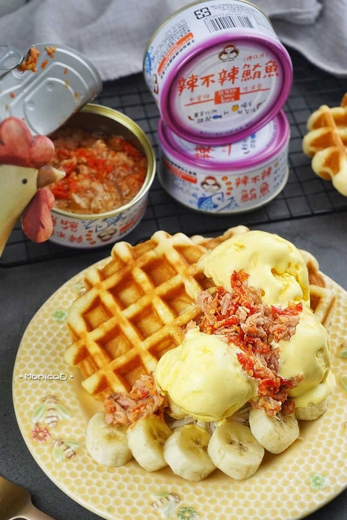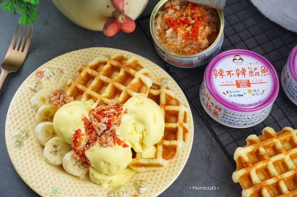 下午茶、深夜食堂吃什麼?開罐即食可以縮短備餐時間,【無添加辣不辣鮪魚】以獨特剁椒秘製,將鮮美的煙仔虎濃縮於辣椒基底,微微辣感宛如蜻蜓點水般滑過舌尖,即使不敢吃辣者也能恣意享用,緊實魚肉不糊爛,融合辣椒籽與辣椒皮碎末,伴隨蒜香氣令人垂涎三尺,我自創的冰淇淋鮪魚鬆餅甜食,鹹甜混搭吃法有幸福感覺~。